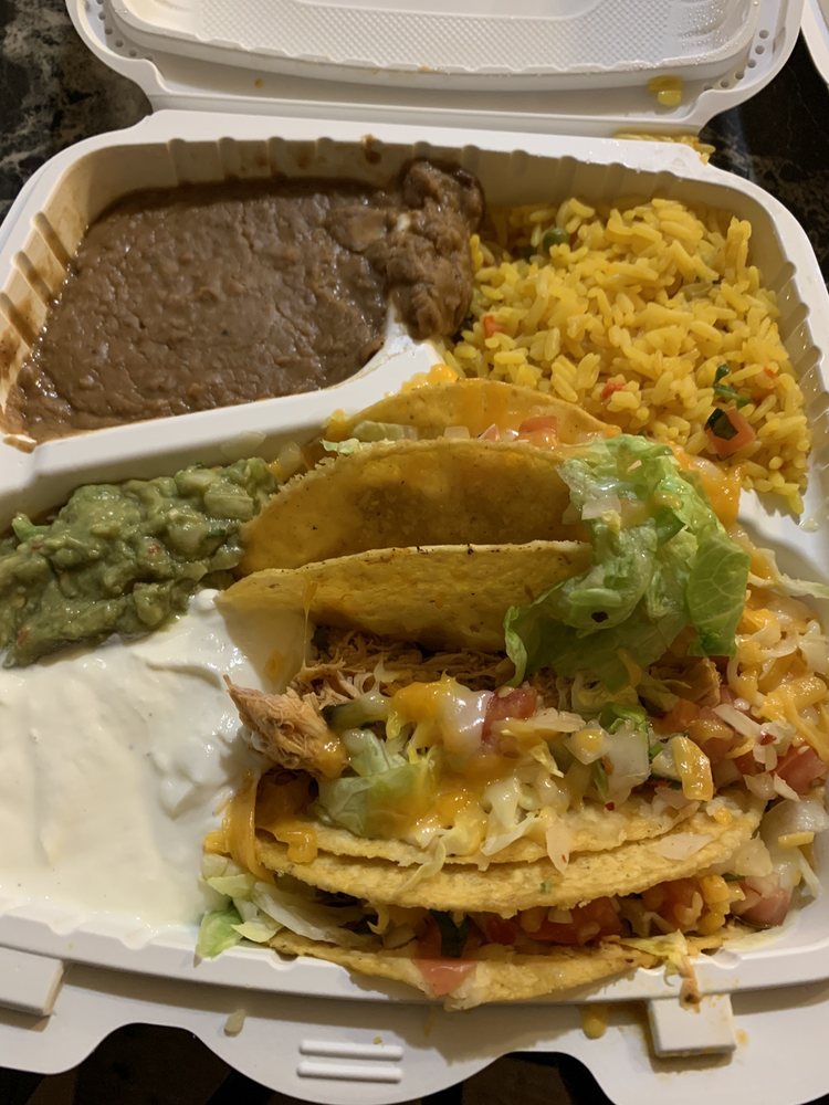 3 crispy corn taco shells filled with chicken, topped with lettuce, pico de gallo, and cheese, served with refried beans, Mexican rice, guacamole, and sour cream.