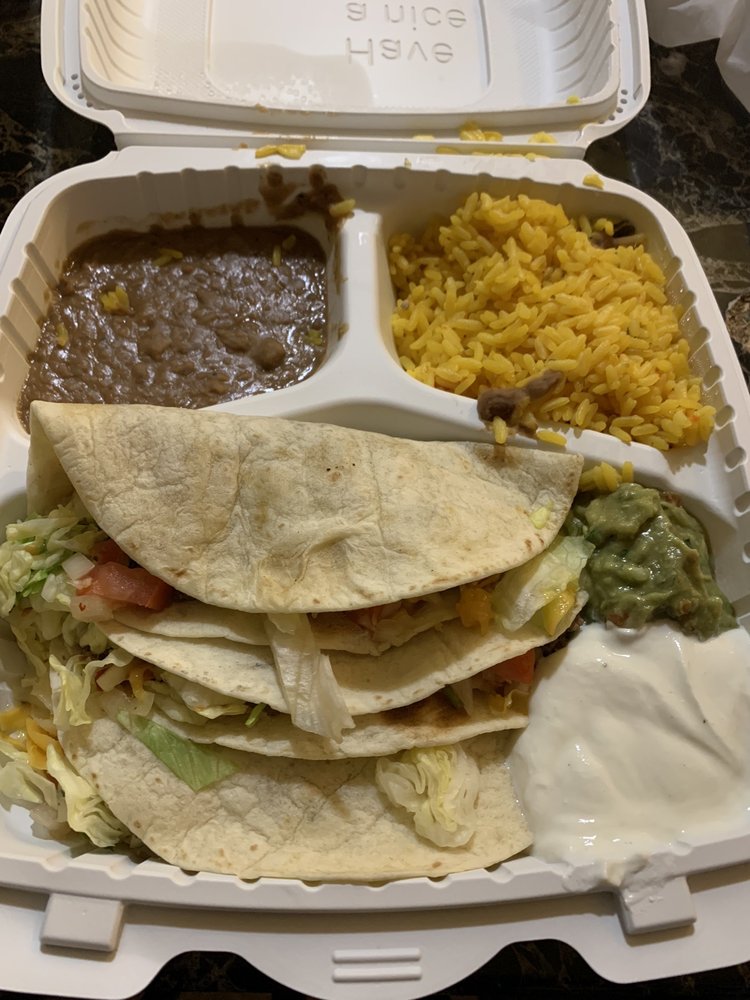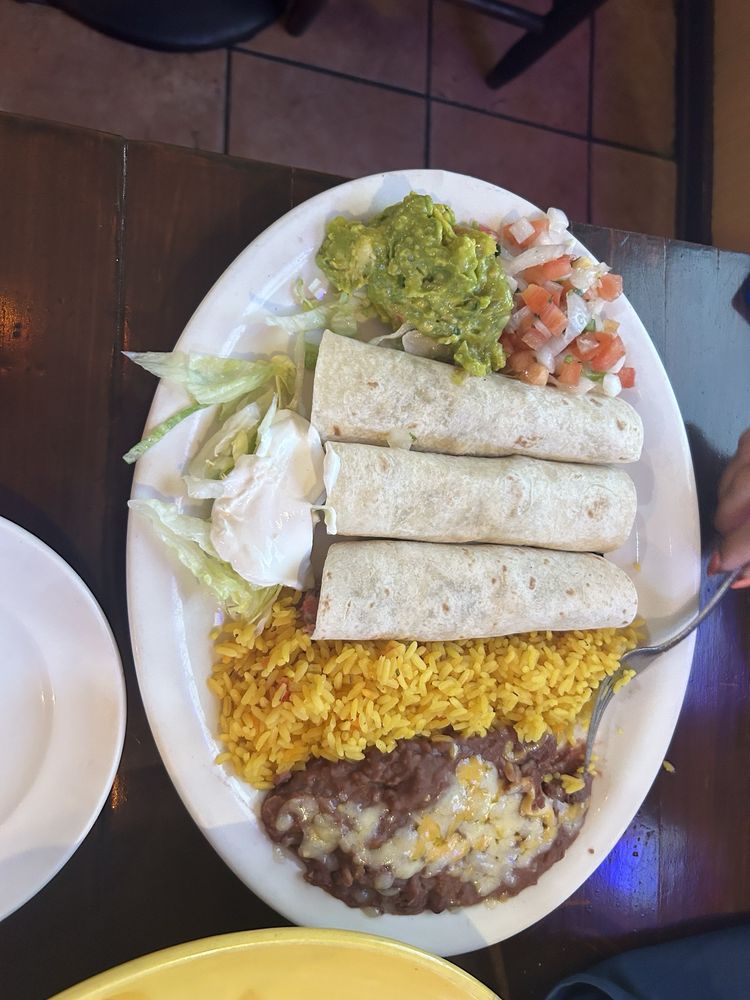 3 crispy corn taco shells filled with beef, topped with lettuce, pico de gallo, and cheese, served with refried beans, Mexican rice, guacamole, and sour cream.