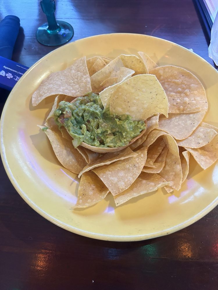 A crispy flour tortilla bowl, filled with fresh guacamole, and served with flour tortilla chips.